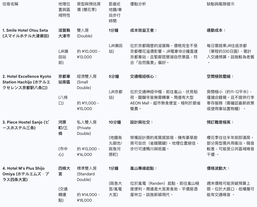 - 住宿推薦: 例如「Smile Hotel 距離地鐵 5 分鐘,優點是便宜,缺點是房間較小」。
