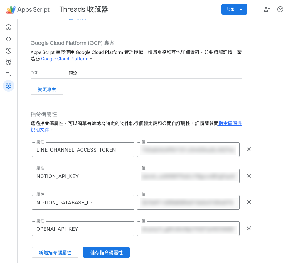 在第一個步驟中我們取得了 LINE Channel Access Token、Notion API Key、Notion Database ID、OpenAI API Key,分別貼到 Google Apps Script 的指令碼屬性裡。