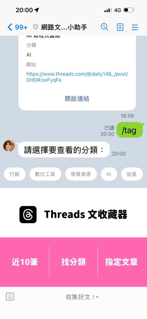 - 當你打出 /tag:LINE 機器人會跳出分類按鈕,按下按鈕可看到該分類的近 10 筆 Threads 文