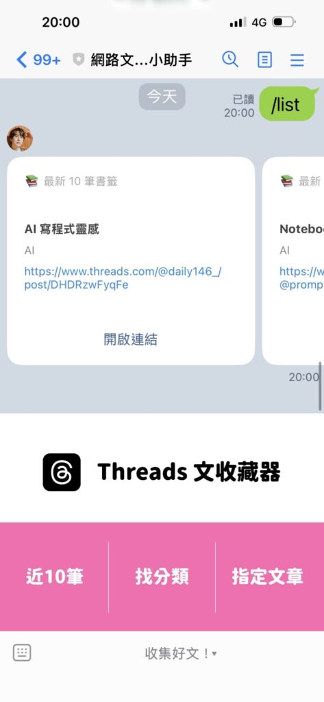 - 當你打出 /list :LINE 機器人會回覆近 10 筆的收藏 Threads 文